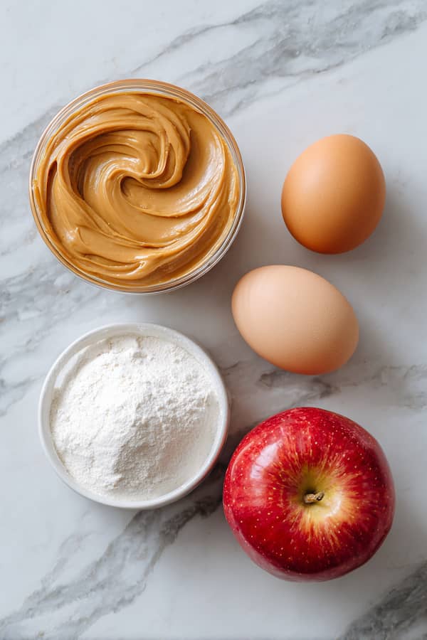 In a mixing bowl, combine chopped apple, egg, peanut butter, and baking powder. Stir until you have a smooth, uniform batter. If the batter seems too thick, add a teaspoon of water; if too thin, add a pinch more finely chopped apple.