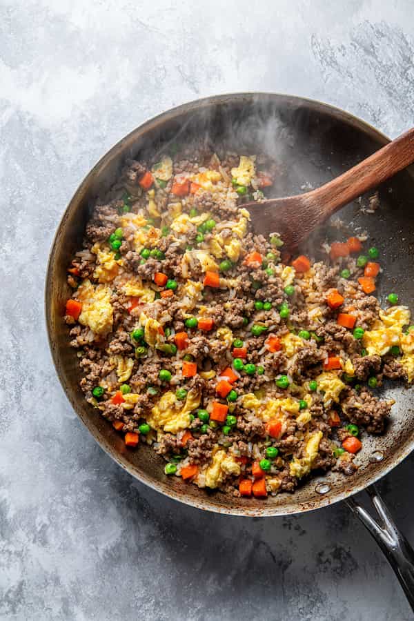 Stir in the pre-cooked rice, mixing well to distribute evenly and warm through completely. The rice should absorb some of the beef juices, creating a more unified dish. Ensure all rice grains are separated and evenly distributed to prevent clumping.