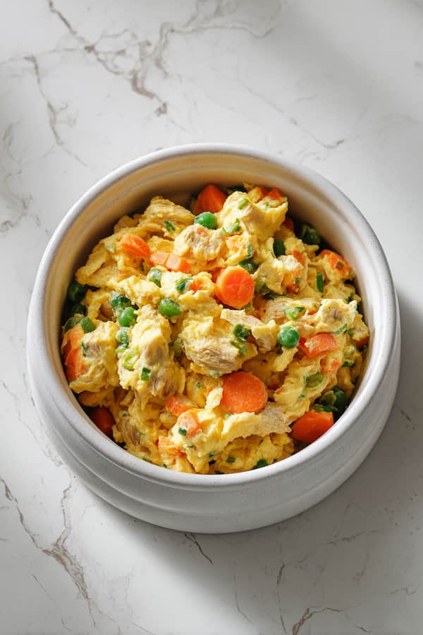 Crack eggs directly into the salmon mixture and scramble until fully cooked, creating a cohesive, protein-rich foundation. Use gentle heat to prevent the eggs from becoming tough, which can reduce their digestibility. The combination creates a complete amino acid profile that’s particularly beneficial for senior dogs with changing nutritional needs.