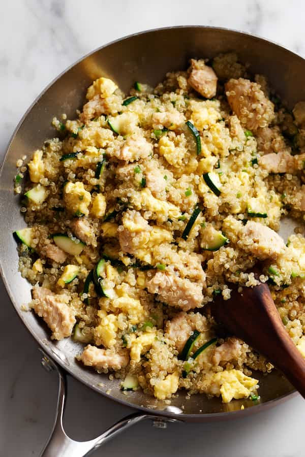 Incorporate the diced chicken and cooked quinoa, stirring to warm through and coat with the aromatic coconut oil. The quinoa should maintain its individual grain structure while absorbing the flavors from the oil and chicken.