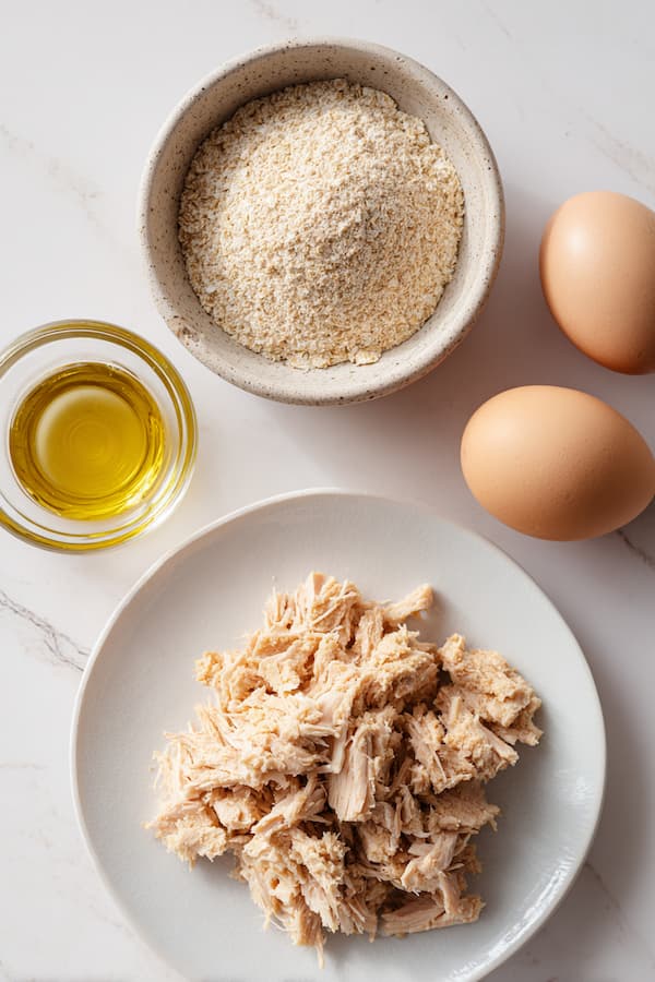 Crack the egg into a medium bowl and whisk with cooled coconut oil until pale yellow and emulsified. Open the canned chicken and add both meat and liquid to the bowl. Break up larger chunks with a fork until the chicken is shredded and evenly distributed. Fold mixture until cohesive, with no large clumps remaining (it should still look quite wet).