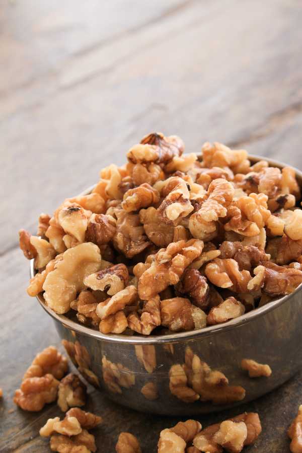 Serving Guidelines: Use sparingly due to high fat content. Remove shells completely. Small dogs: 1/4 walnut weekly, medium dogs: 1/2 walnut weekly, large dogs: 1 walnut weekly.