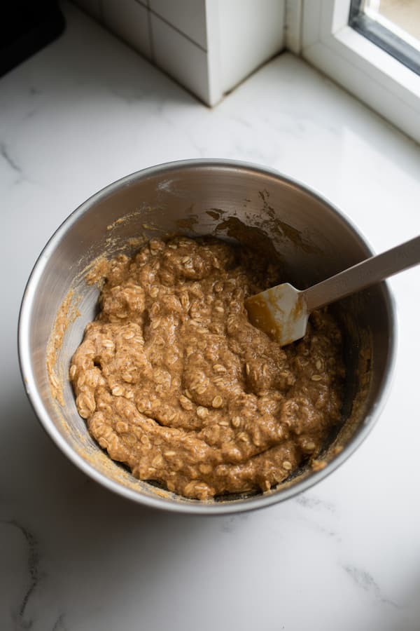 Pour the wet ingredients into the bowl with the dry ingredients. Using a wooden spoon or sturdy spatula, stir everything together. At first, it will seem too wet and soupy—that’s completely normal. Keep stirring for 1-2 minutes until all the oats are moistened and the mixture starts clumping together.