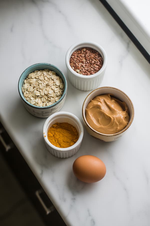 In a large mixing bowl, add the instant oats, ground flaxseeds, and turmeric. Whisk them together thoroughly with a fork or small whisk until the turmeric is evenly distributed throughout the oats. You should see flecks of golden color throughout—no clumps of turmeric in one spot.