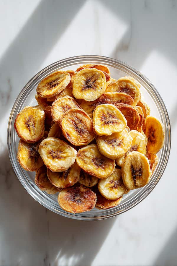 After 6 hours, start checking the chips more frequently. They’re done when they feel leathery to firm and have no moisture when squeezed. Total time ranges from 6-12 hours depending on your dehydrator model, humidity levels, and how thick you sliced the bananas. For crispy chips, aim for 10-12 hours. For chewier treats, stop at 6-8 hours.
