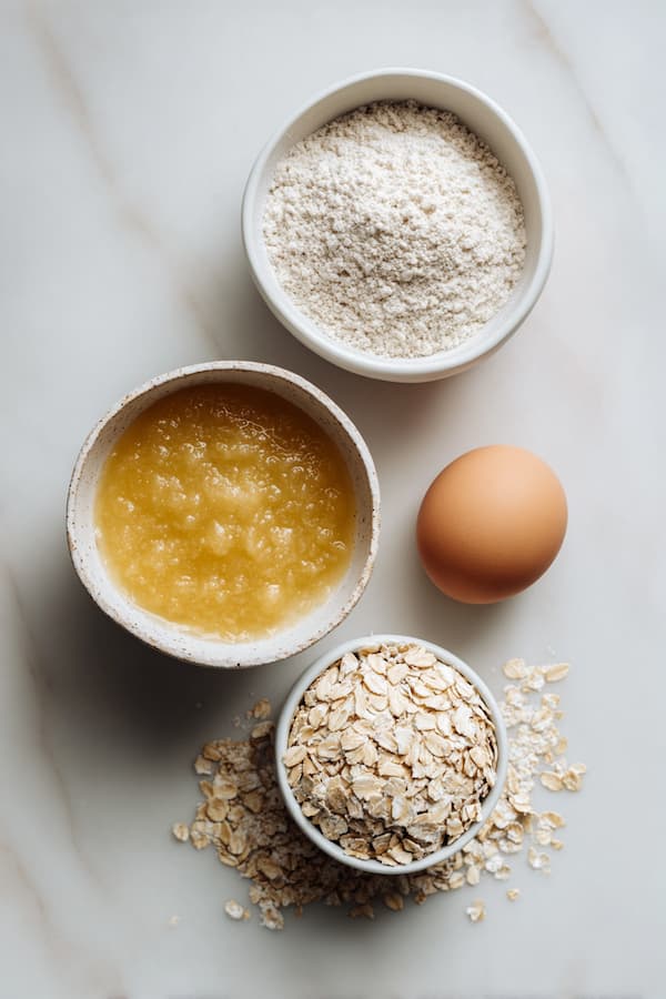 In a large mixing bowl, measure and add the oat flour, rolled oats, and unsweetened applesauce. Pour in the larger portion of beaten egg (everything except that 1 tablespoon you set aside). The bowl should look like a combination of wet and dry ingredients that haven’t quite come together yet.