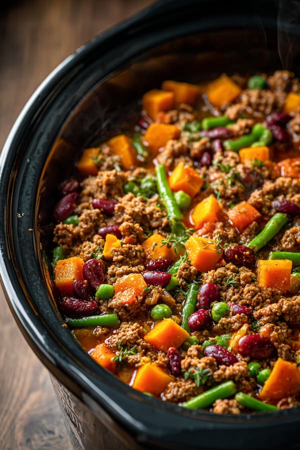 This recipe is designed for a large 6-quart slow cooker. Add the ground beef (break it up a bit with a spoon), uncooked rice, butternut squash, carrots, peas, and water.