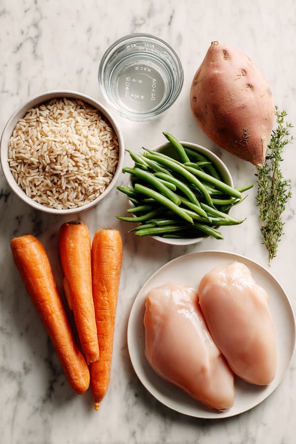 This is my go-to recipe for busy weeks. It uses affordable brown rice to bulk up the meal and gentle chicken breast which is easy on sensitive tummies. The slow cooker does all the heavy lifting, melding the flavors together until the veggies are tender and the chicken falls apart.