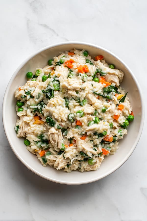 cheap Chicken Thigh & Rice Pot in a dog bowl