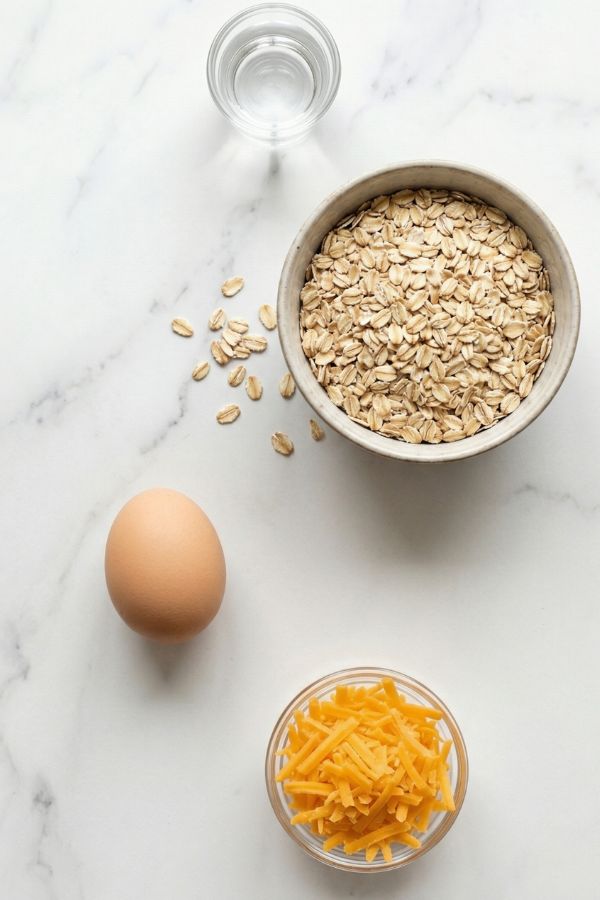 In a medium bowl, combine the oat flour, shredded cheese, and egg. Stir with a fork until everything starts clumping together. Add water one tablespoon at a time, mixing between each addition, until the dough holds together when you squeeze a handful. It should feel like wet sand that sticks to itself. Not sticky-wet, not dry-crumbly.
