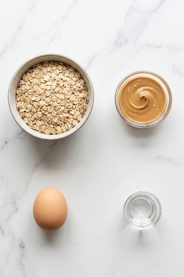 Combine the oat flour, peanut butter, and egg in a medium bowl. Stir with a fork until it starts clumping. Add water one tablespoon at a time until the dough holds together when you squeeze it. You want it firm, like Play-Doh. Not wet, not crumbly. If the peanut butter is cold and stiff, microwave it for 10 seconds first.