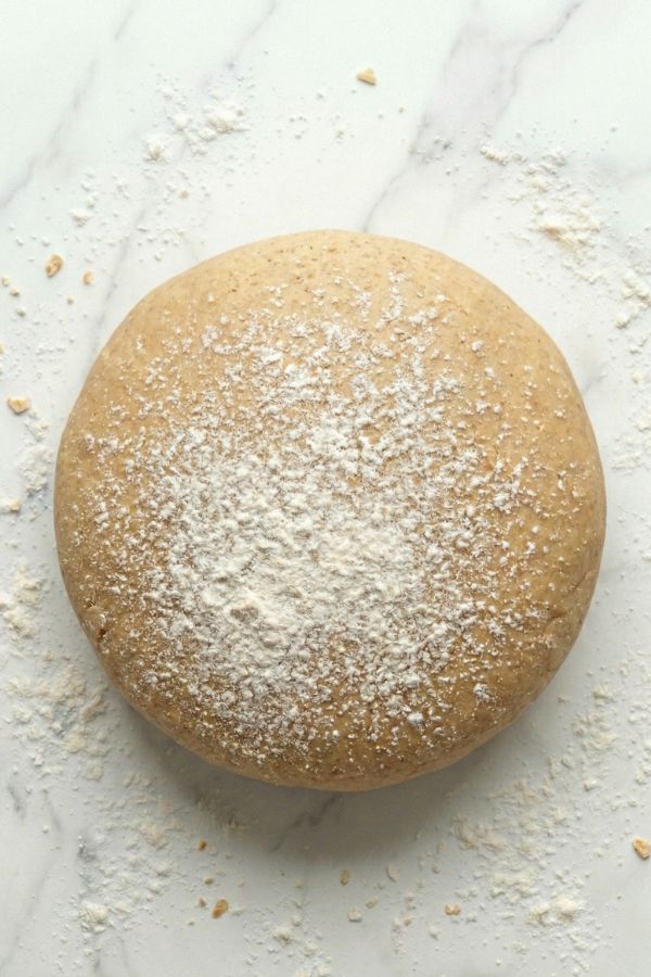 Dust your counter or cutting board with a little oat flour. Press the dough out with your hands or a rolling pin to about 1/4 inch thick. Cut into small squares, circles, or whatever shape you want. I use a butter knife and cut a grid of 1-inch squares. Fastest method, zero cleanup, and Snickers doesn’t care about shapes.